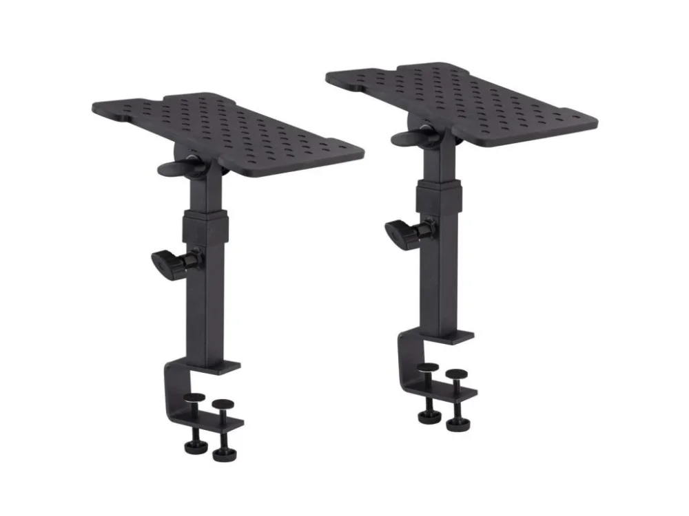 Univerzální stolní stojan vhodný pro studiové monitory a reproduktory. Stojan disponuje podstavcem s pogumovaným povrchem, dvěma šroubovými závity pro připevnění ke stolové desce o výšce do 50 mm, nastavitelnou výškou a sklonem pro detailní nastavení monitoru při nahrávání, mixu, kritickým poslechu nebo finálním masteringu.