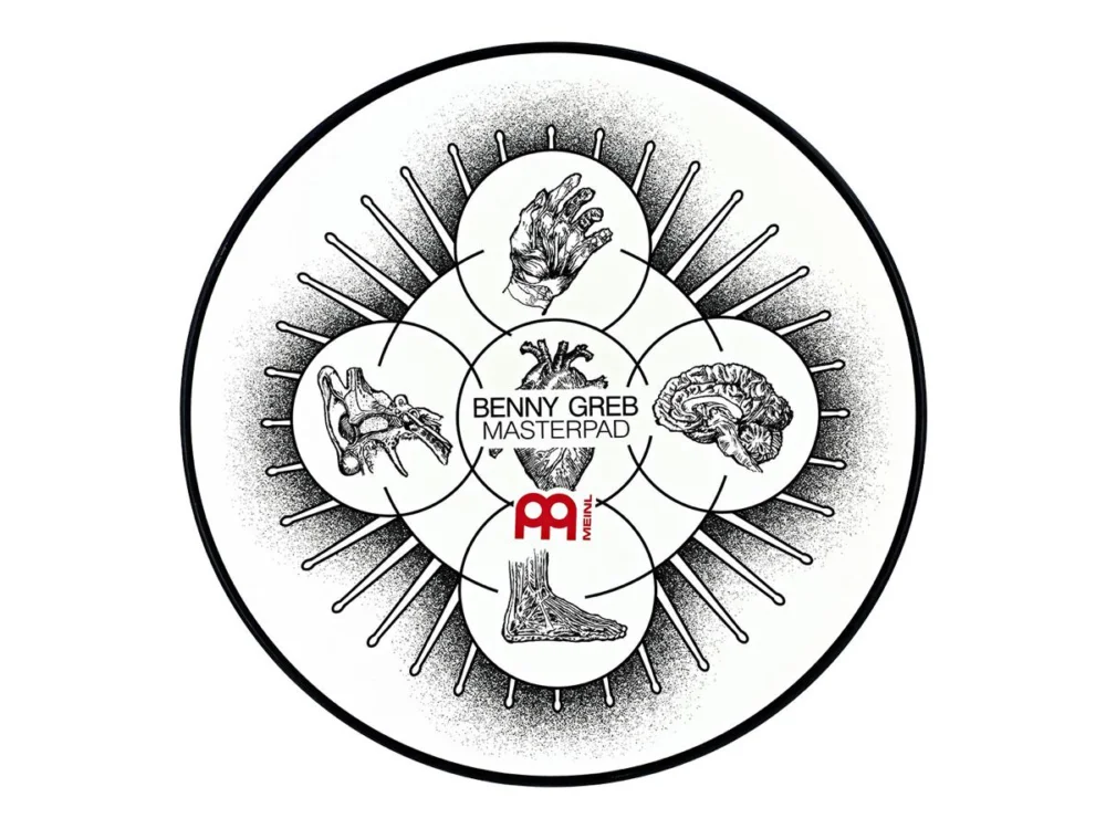 MEINL MPP-12-BG – Cvičný pad s designem Bennyho Greba, průměr 12 „, možnost připevnit na běžný stojan, spodní strana pokryta gumou, s 8 mm závitem.