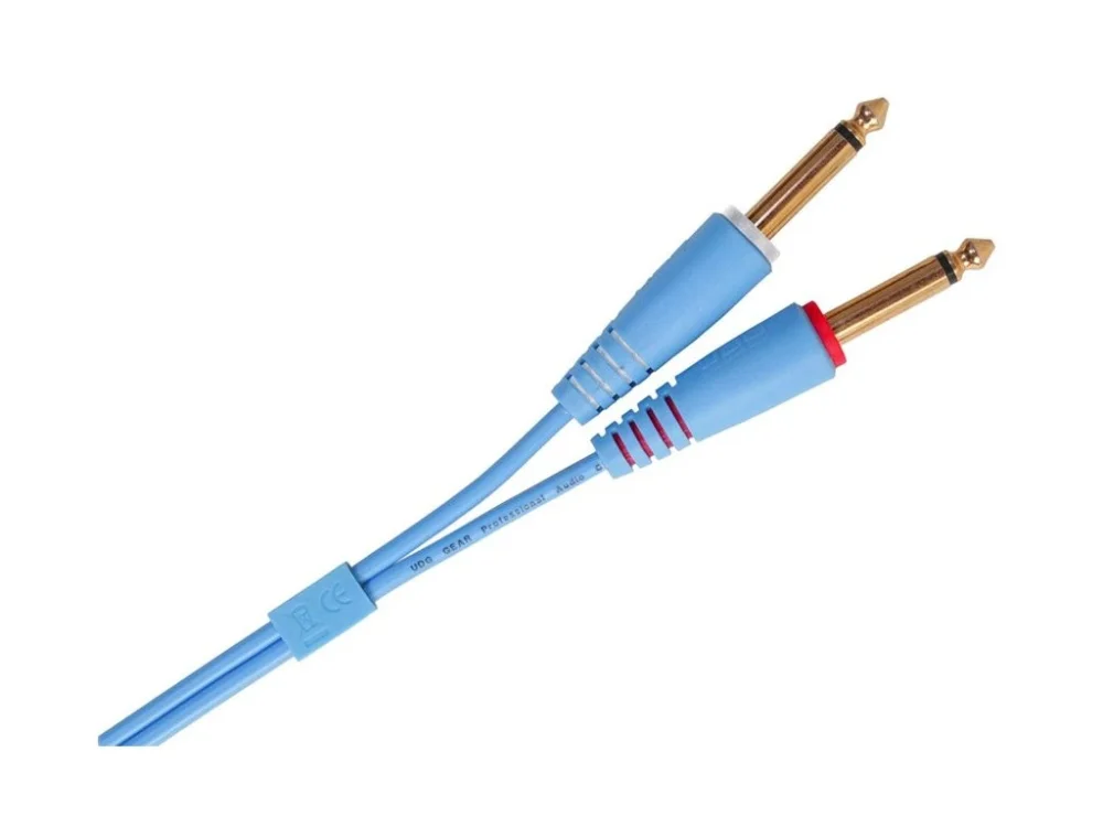 Dvojitý audio kabel s konektory TS 6,3 mm (velký jack) k propojení DJ, profesionálních i komerčních přístrojů, zlacené kontakty konektorů, kvalitní stínění, mechanická odolnost, barva modrá.