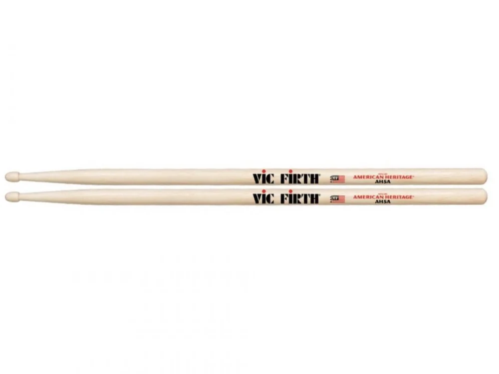 VIC FIRTH 5A – American Heritage, javorové paličky s kulatější hlavičkou, díky které mají paličky bohatší zvuk u činelů, průměr: 14 mm, délka: 406 mm