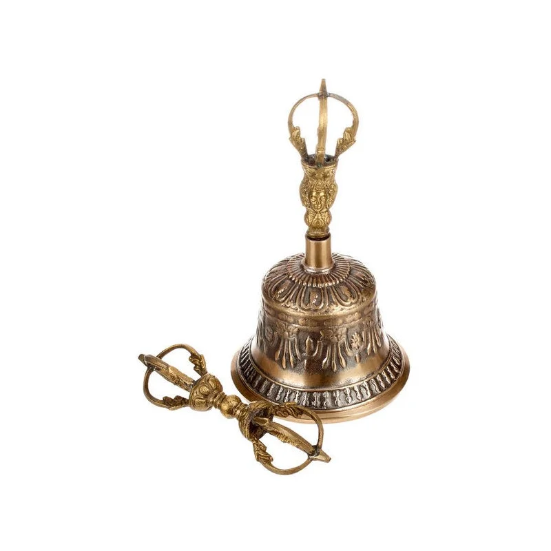 Tibetský zvonek s výškou 21 cm a dolním průměrem 11 cm vyrobený z mosazi.
