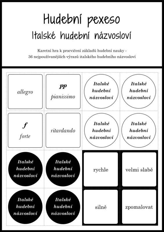 Značkový Hudební pexeso – Italské hudební názvosloví – 72 kartiček pro zábavnou výuku hudební nauky