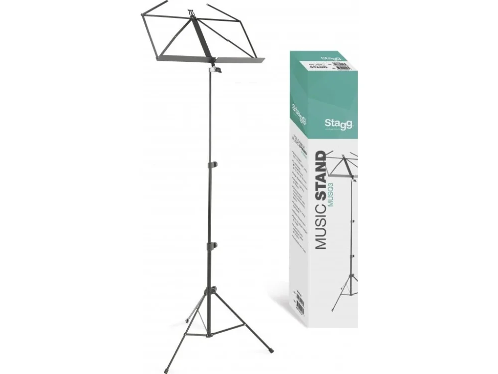 Notový skládací stojan s nylonovým pouzdrem, třídílná kovová konstrukce s nylonovými spojovacími částmi, pružinové držáky stránek, nastavitelná výška 51 – 117 cm, průměr trubek 8 mm, 12 mm, 16 mm, hmotnost 1,06 kg. Barva černá.